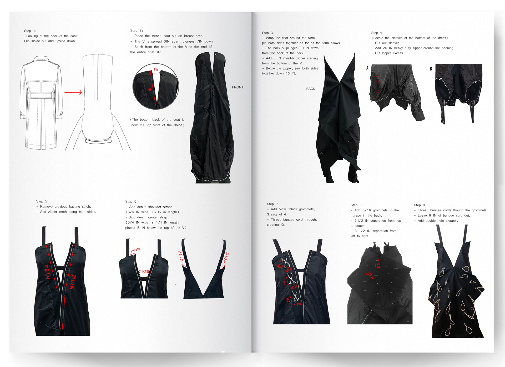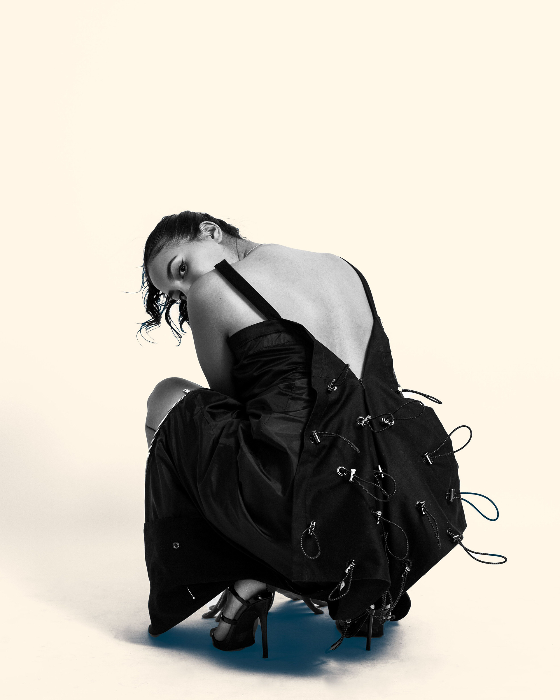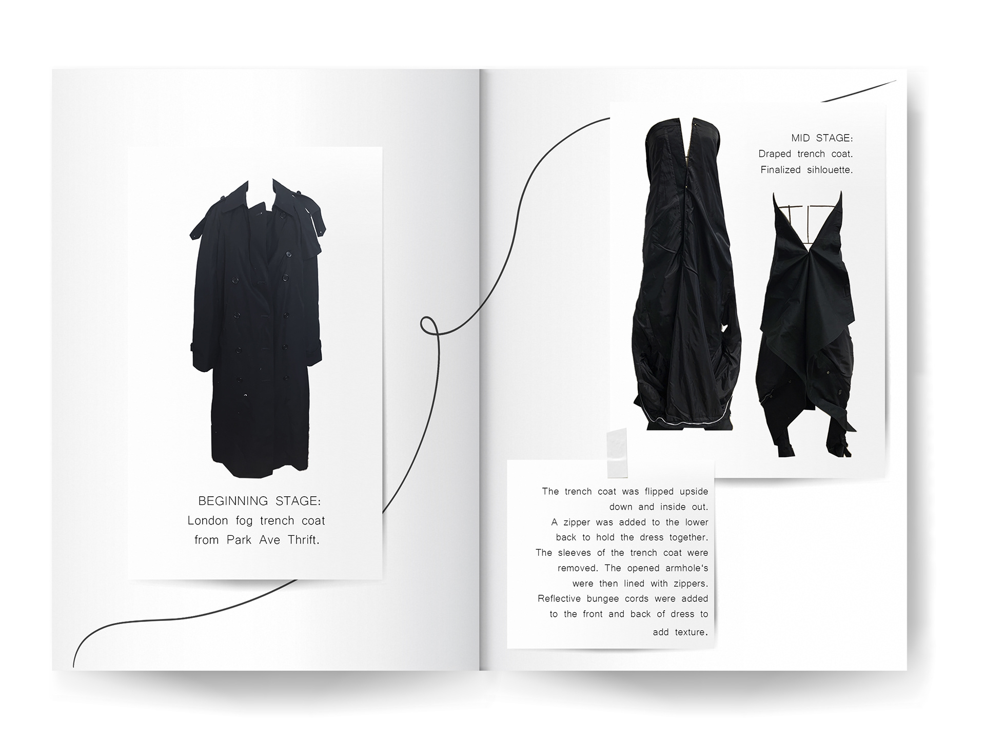 Created during my senior year at SCAD (Fashion Design BFA, 2020), this collection focuses on sustainability and silhouette play under my brand, Ninesixteen. Every look started with a thrifted black trench coat that I reworked into a dress through draping, reconstruction, and small unexpected details. Bungee cords, twists, and new cuts helped reshape the original coat into something completely different, reflecting my interest in reimagining existing garments into modern, expressive silhouettes.